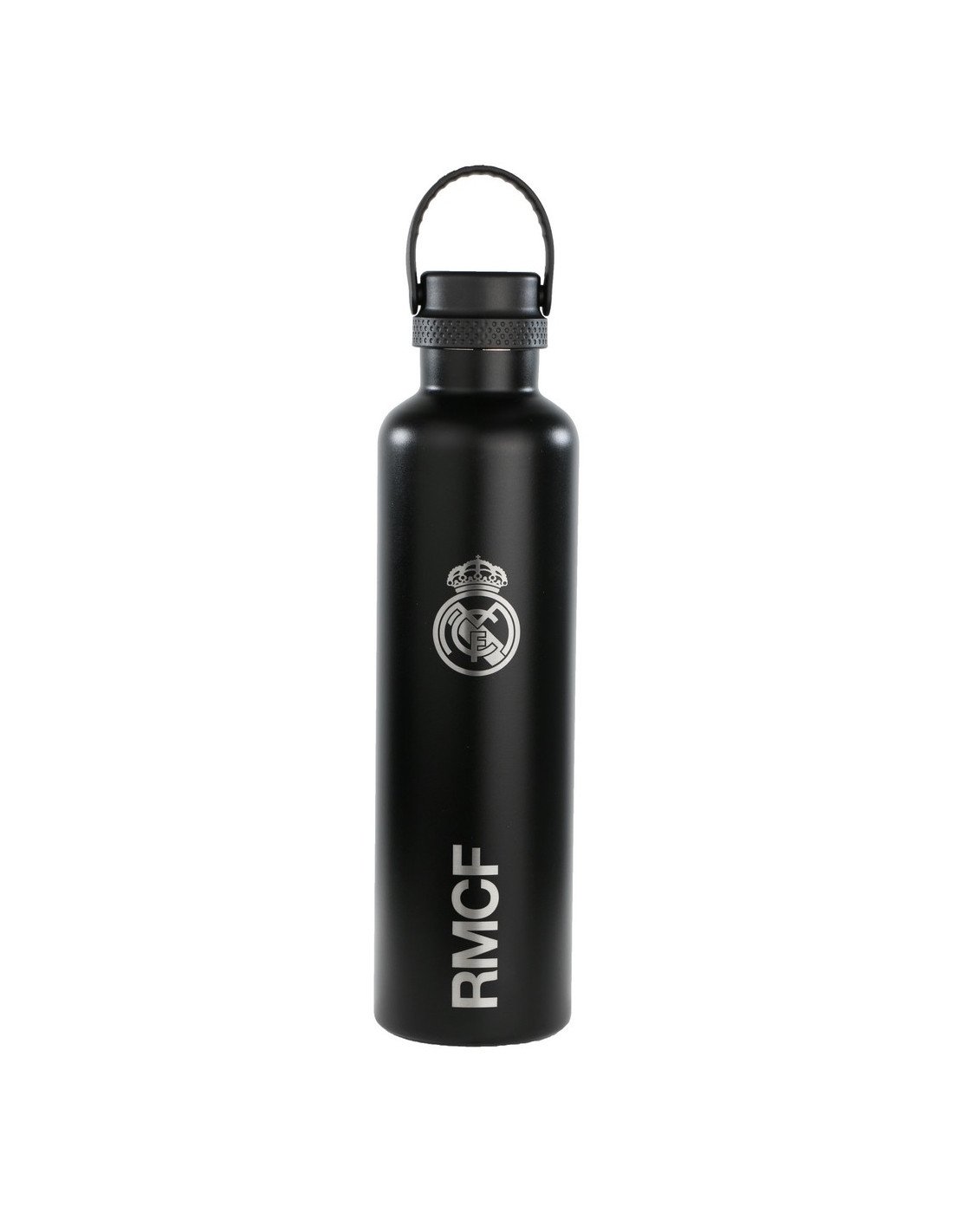 REAL MADRIDBotella termo de acero inoxidable. Alta calidad. Botella con doble pared de acero inoxidable con aislamiento. Mantiene 12h liquido caliente. Mantiene 24h el liquido frio. Base de silicona. Producto sostenible, envase reutilizable. Asa en la parte superior.